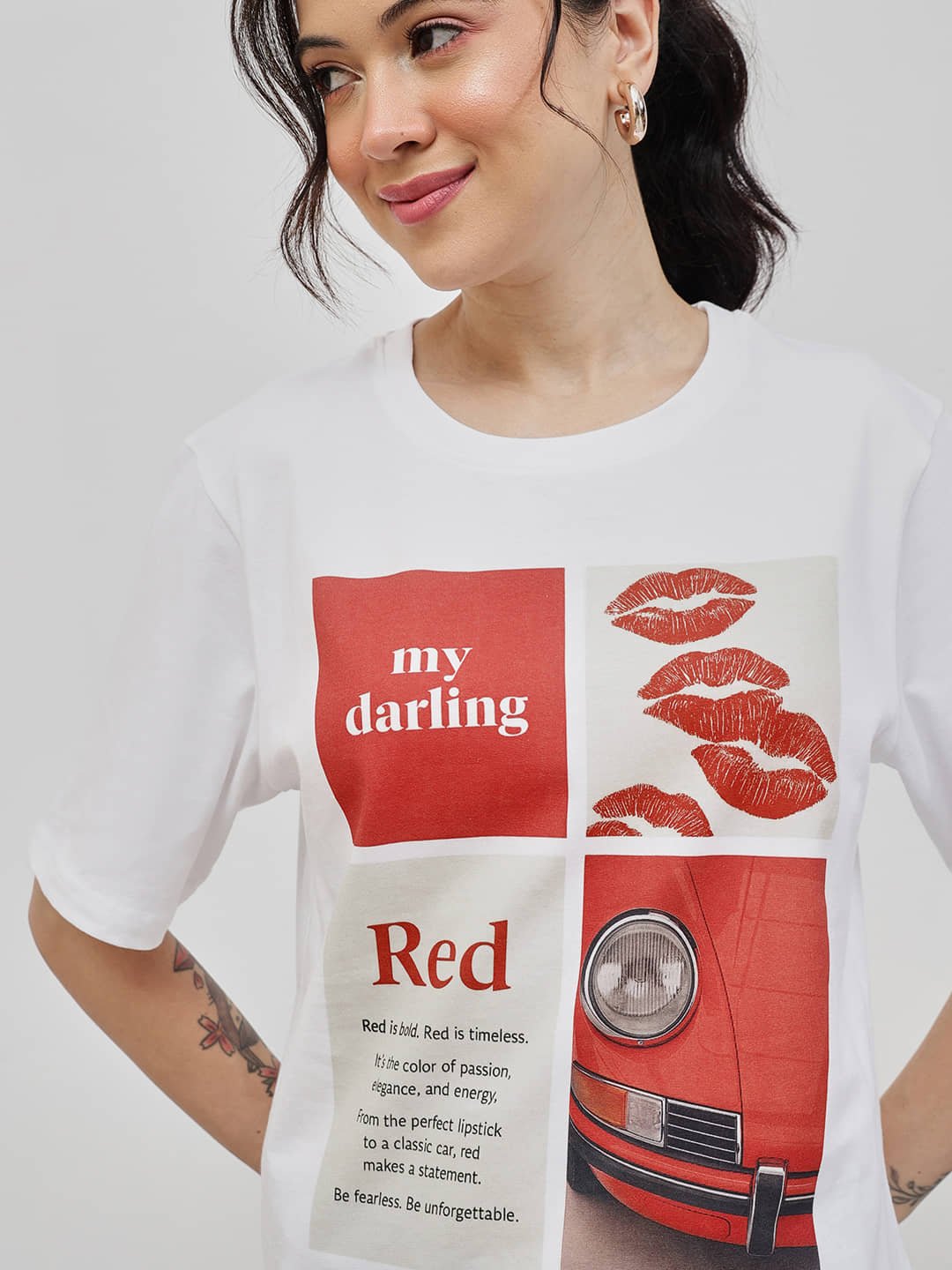 A chic crop-length boyfriend tee featuring the bold “My Darling Red” graphic. Crafted from 100% Fine Cotton with a bio-silicon finish, it offers soft comfort and a confident, modern edge for everyday wear. 100% Cotton Boy Friend Relaxed Fit Printed