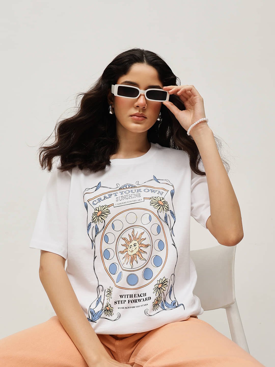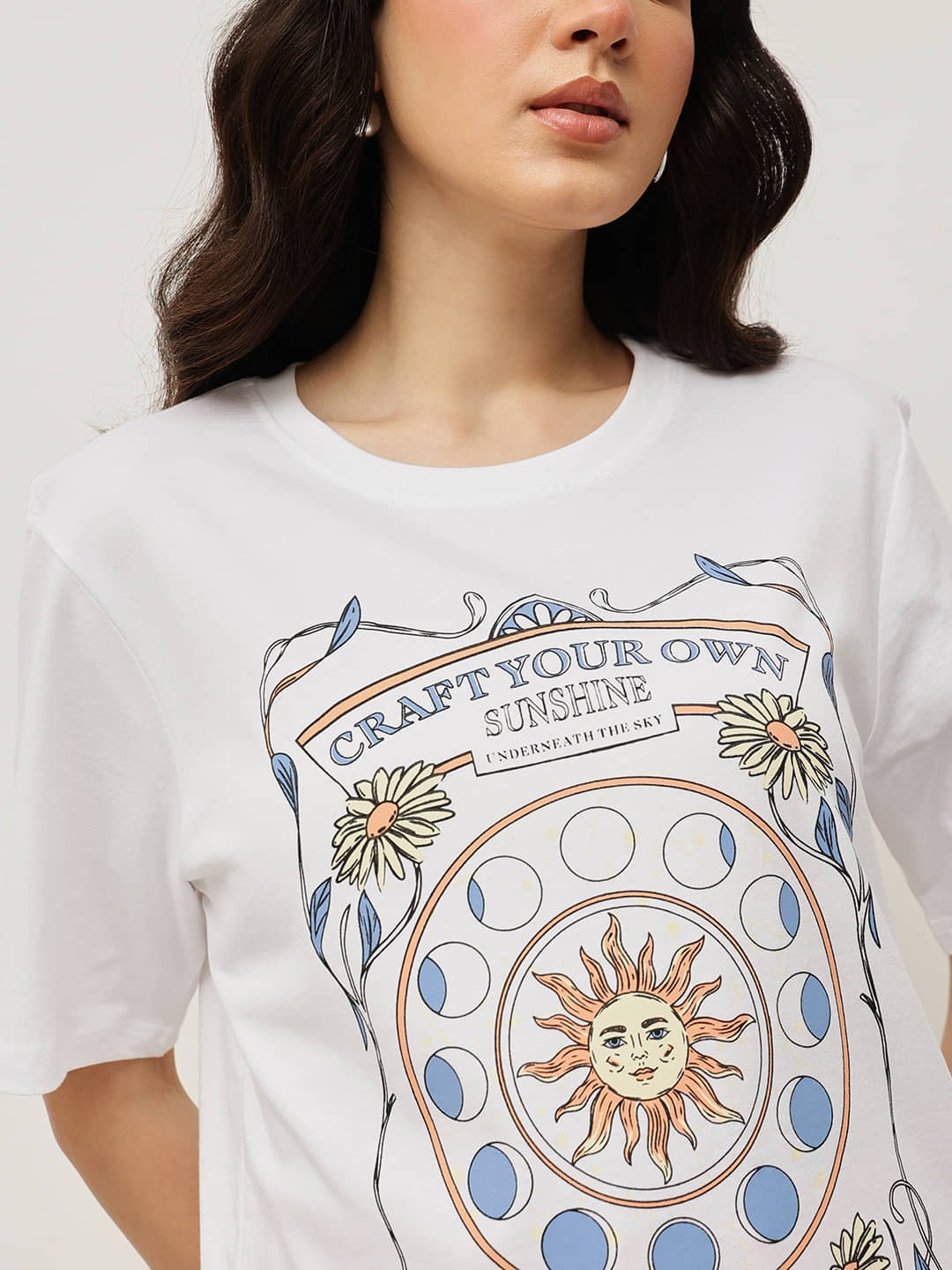 Made from 100% Fine Cotton and delicately treated with a smooth bio-silicon wash, this relaxed boyfriend-fit tee feels luxuriously soft and naturally breathable. Featuring the uplifting “Craft Your Own Sunshine” graphic, it inspires positivity with every wear — blending comfort, charm, and modern expression.