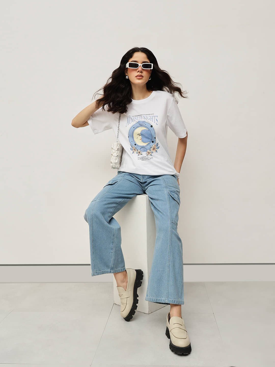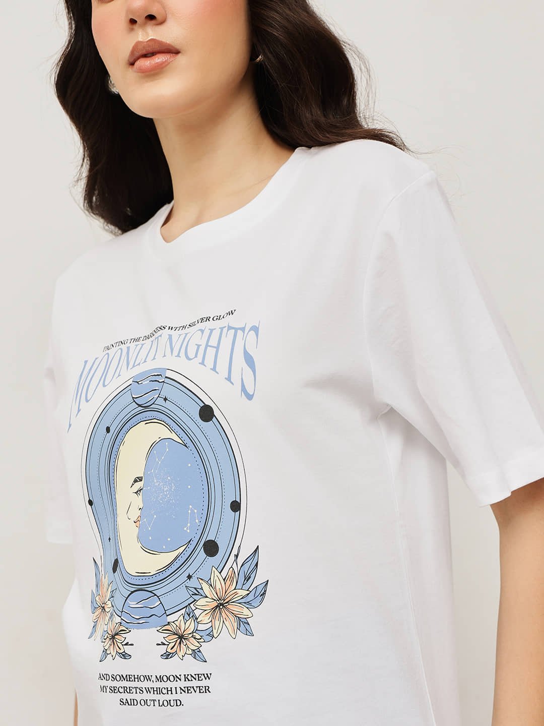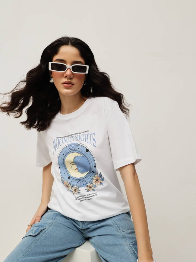 Expertly made from 100% Fine Cotton and treated with a silky-smooth bio-silicon wash, this relaxed boyfriend-fit tee combines softness with lasting quality. Featuring the “Moonlit Nights” graphic, it captures serene charm and celestial beauty — a perfect piece for calm, effortless style.