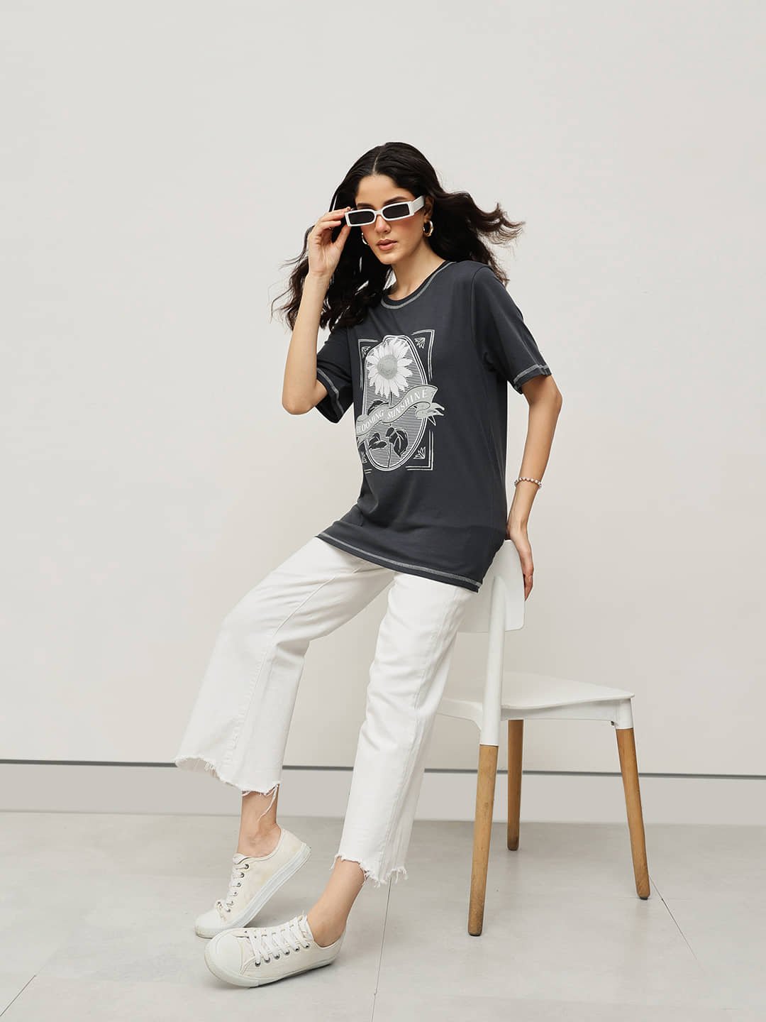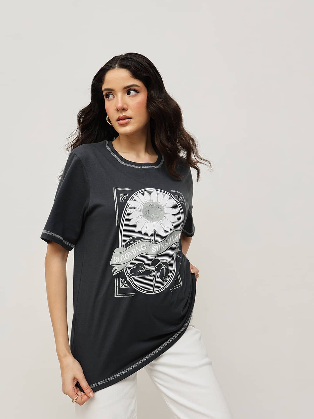 Tailored from 100% Fine Cotton and finished with a soft-touch bio-silicon wash, this relaxed boyfriend-fit tee combines comfort and effortless style. The “Blooming Sunshine” floral graphic radiates positivity, while the contrast stitching adds a modern twist — perfect for a casual yet elevated everyday look.