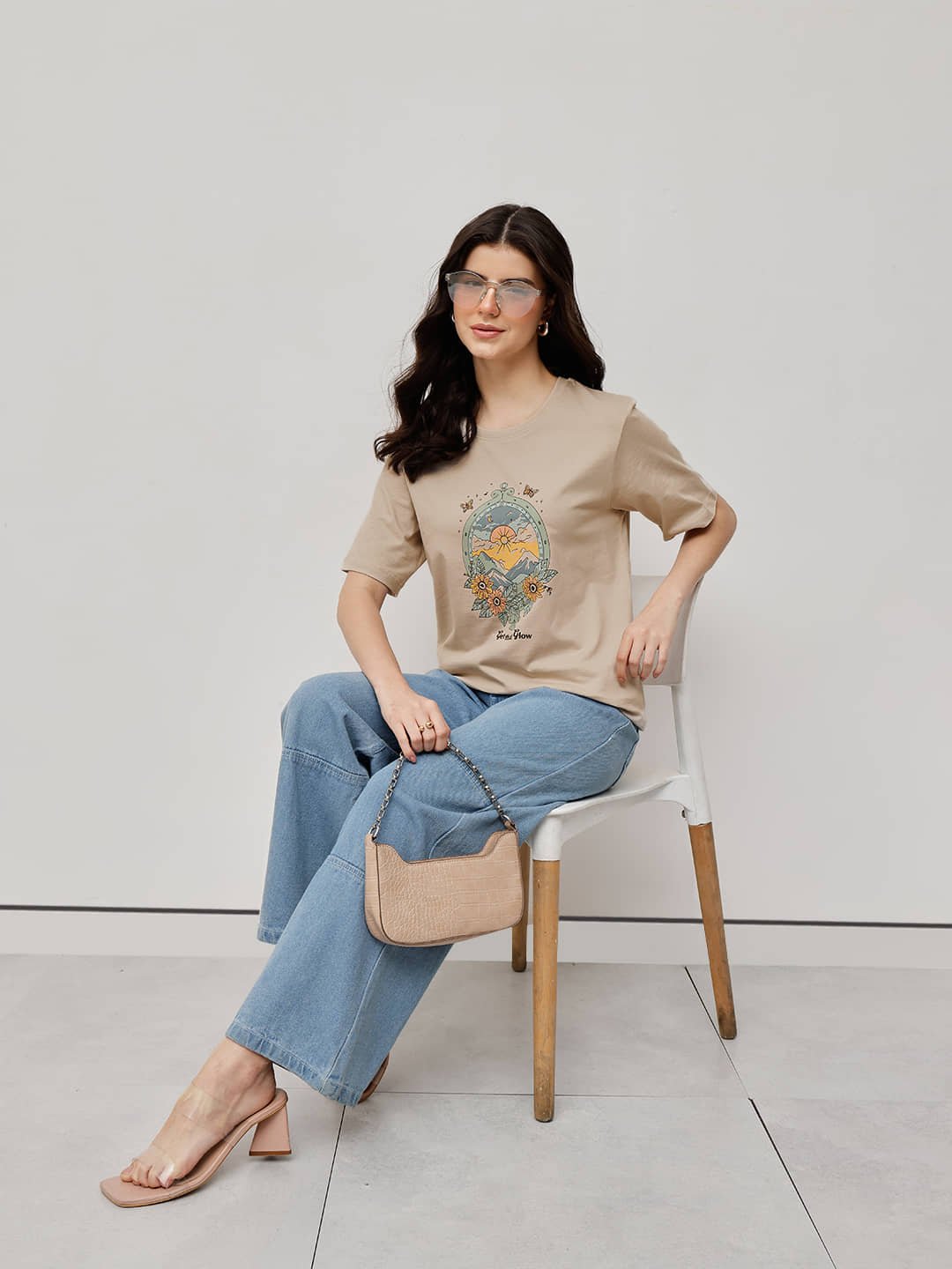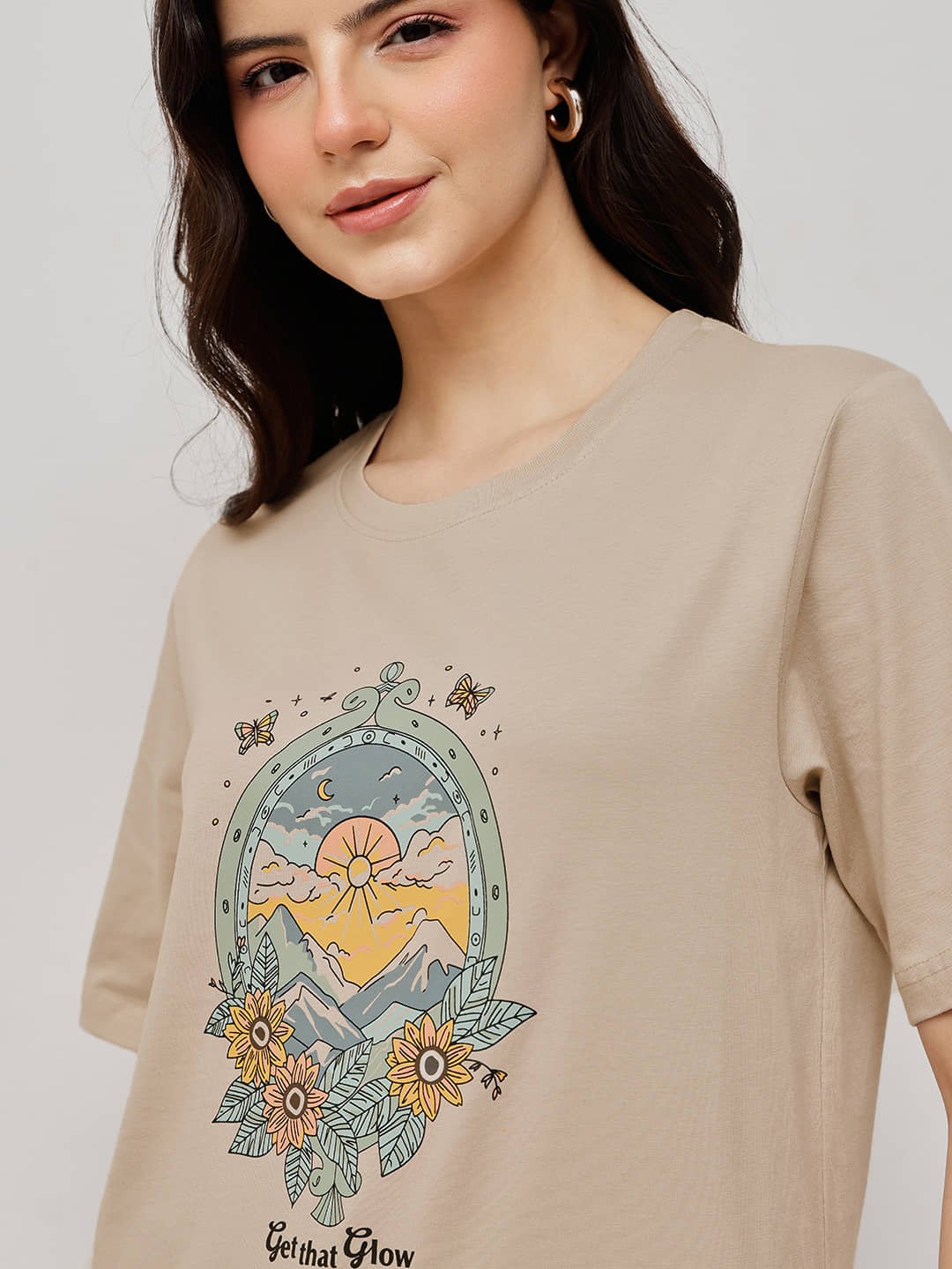 Made from 100% Fine Cotton and perfected with a velvety-smooth bio-silicon wash, this relaxed boyfriend-fit tee brings a natural softness and breathable comfort. The cheerful “Get That Glow” sunrise print infuses positivity and warmth — making it a bright addition to your everyday wardrobe.