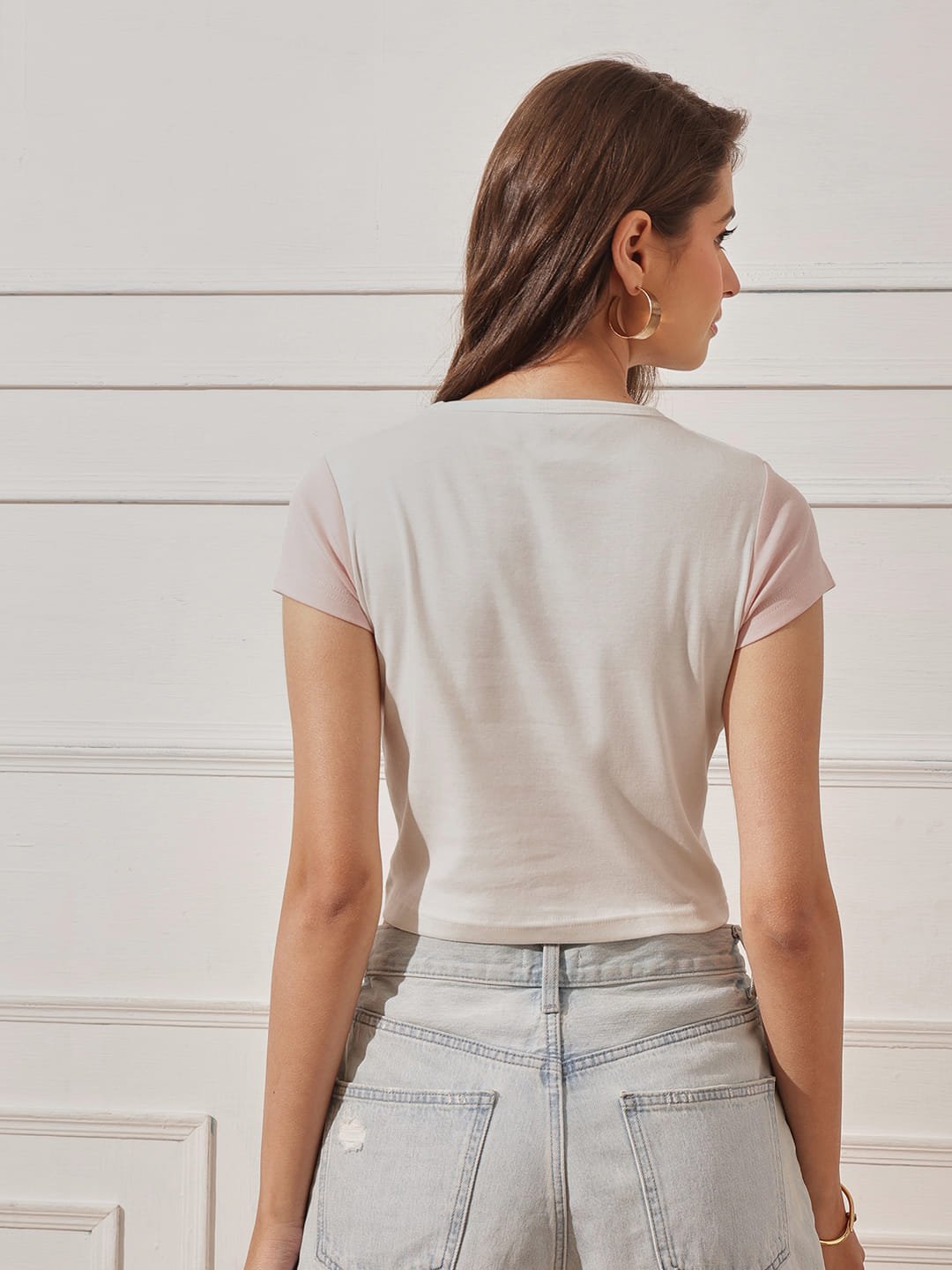- Raglan-style crop top with contrast sleeves for a sporty edge