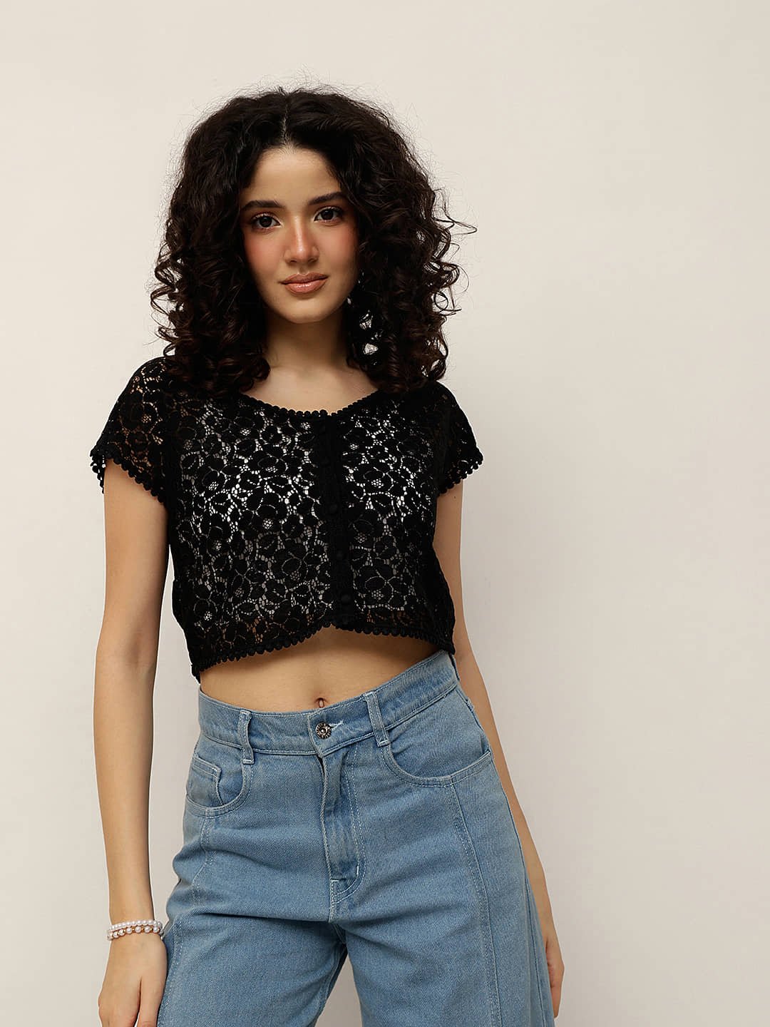 A chic lace shrug that exudes understated elegance. Designed with intricate floral lace and delicate scalloped edges, this cropped style features a soft button-down front that perfectly balances modern simplicity with feminine charm.