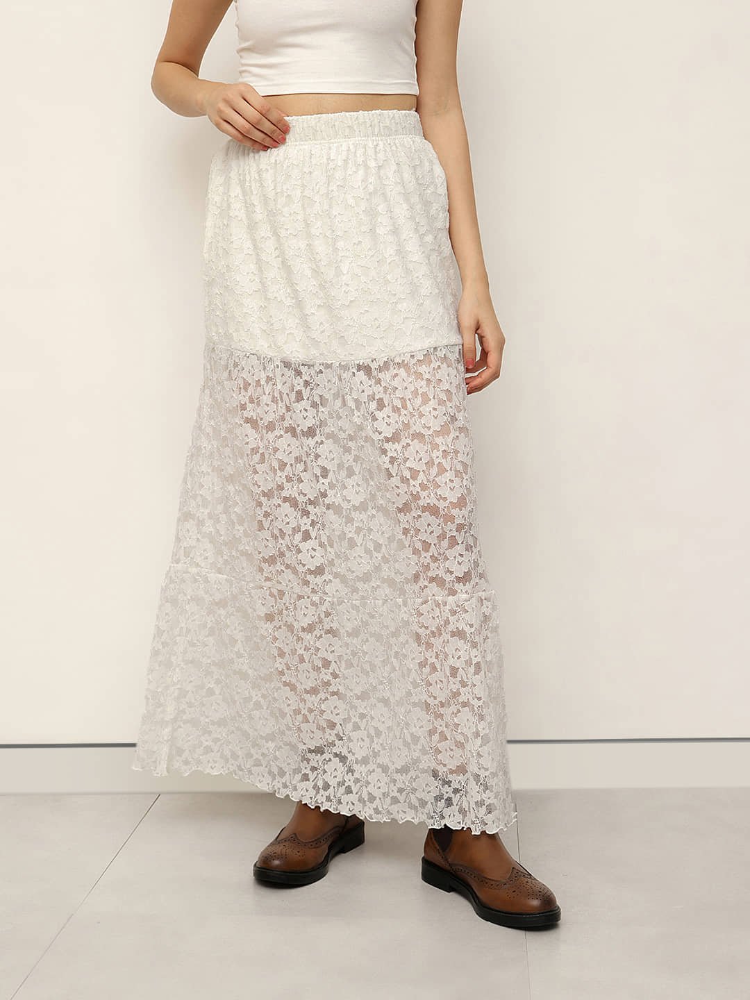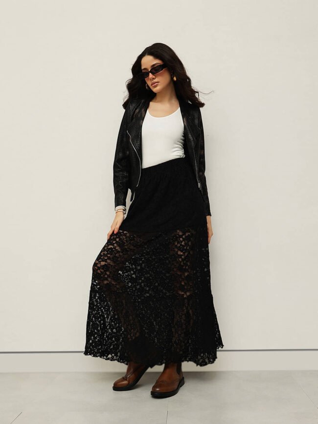A graceful lace maxi skirt featuring delicate floral texture and soft inner lining in viscose-spandex Liva fabric. Lightweight, flowy, and feminine — perfect for elevated day-to-evening dressing.