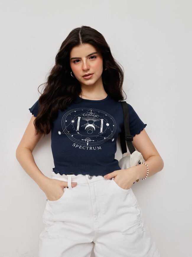 Crafted from 100% Fine Cotton and refined with a soft bio-silicon wash, this crop top blends cosmic artistry with youthful flair. The “Cosmic Spectrum” print adds a celestial charm, while the lettuce-edged hems bring a playful, feminine finish — soft, stylish, and effortlessly cool.