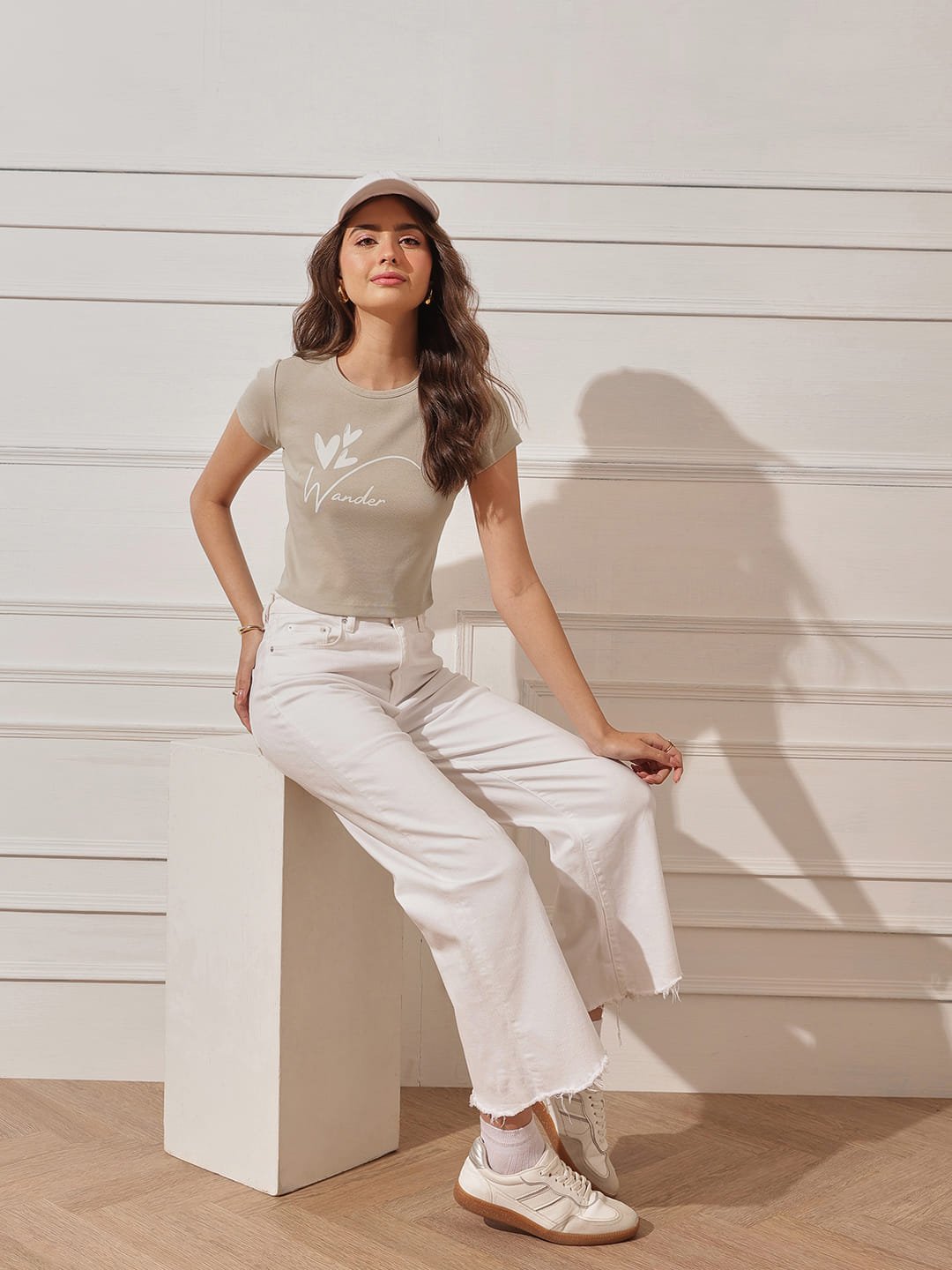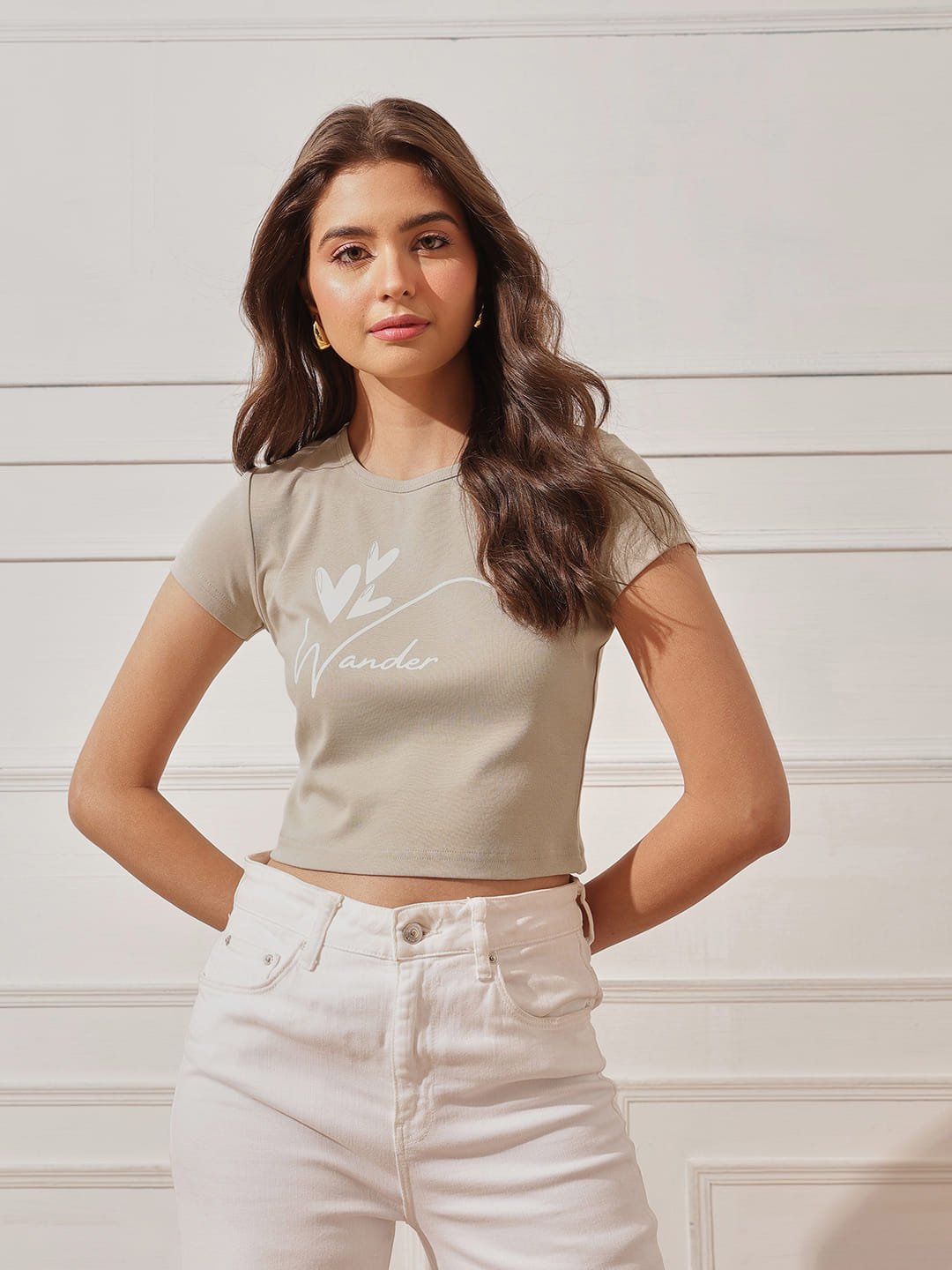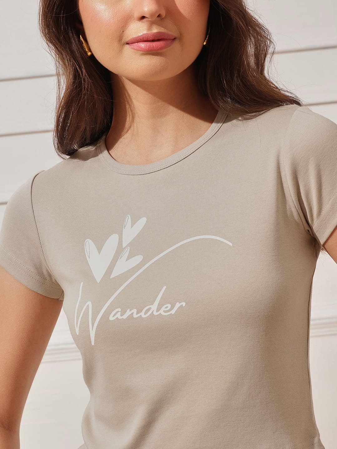 Crafted from 100% cotton, this crop top offers a soft, breathable feel with a flattering, body-skimming fit for all-day comfort. Delicate heart-line graphic adds a subtle, dreamy wander touch—perfect for relaxed, feel-good looks.